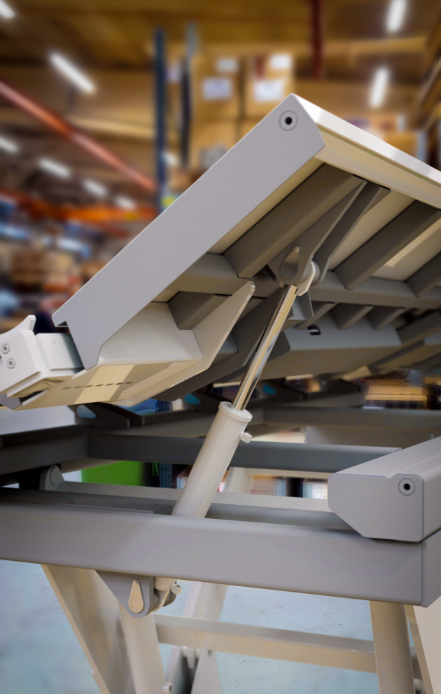 Lyftborden har kraftiga massiva stålarmar med minimal nedfjädring som är sidostyrda i bottenram och bordsskiva. Därför är MittCon lyftborden mycket stabila även mot sidokrafter.